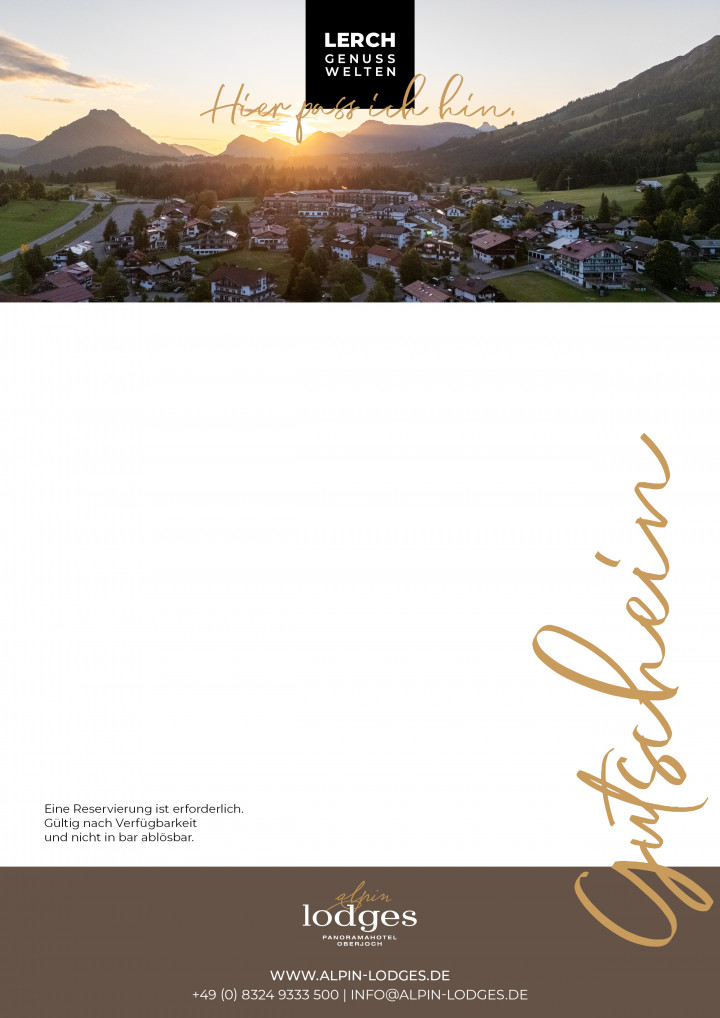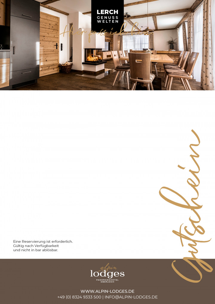 Einzulösenin den Alpin Lodges für jegliche Hotel- und Restaurantleistungen: Hotelübernachtungen, Kaffee & Kuchen, Abendessen, Brunch, Massagen, Drinks und und und ...